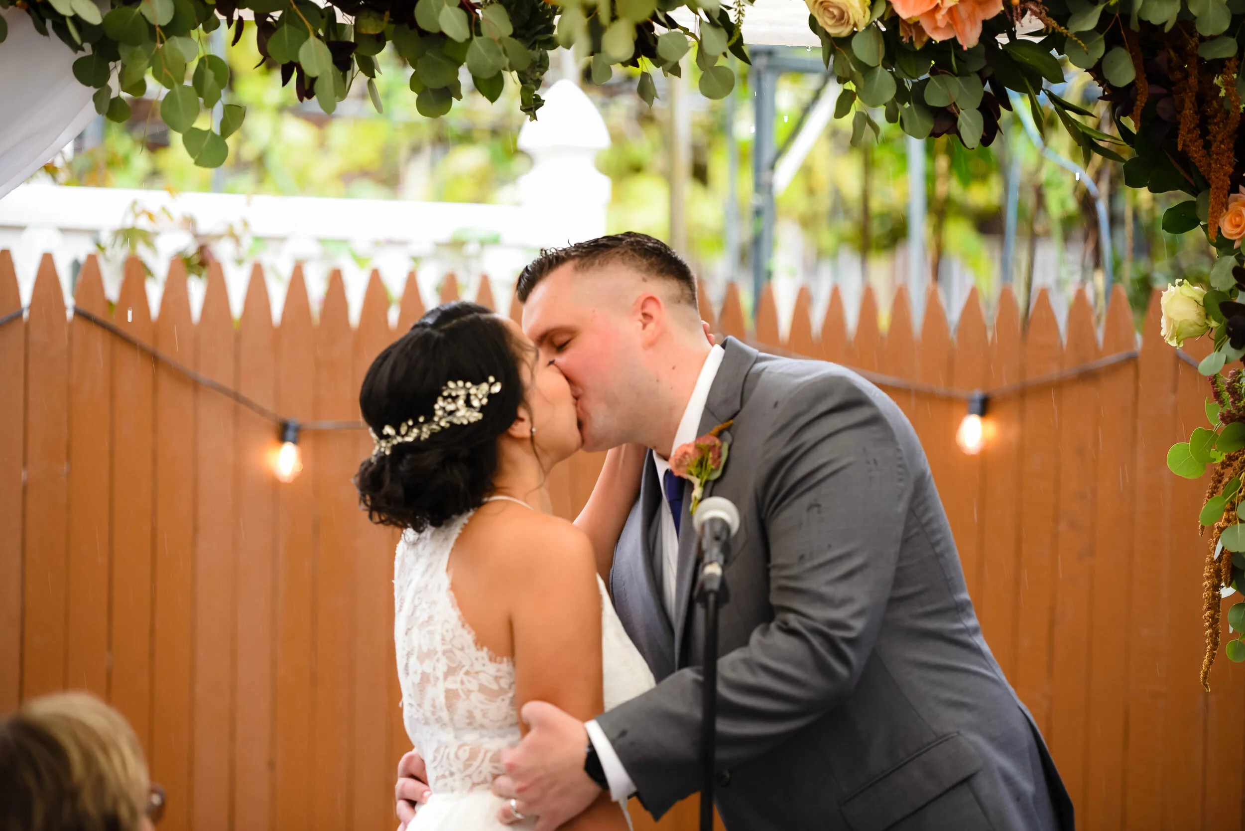 On the day of their wedding, there was a torrential downpour. Luckily, we planned for this and came prepared with tents. The space was transformed with the rich fall florals that adorned the wedding arch. Despite the rain, the intimate ceremony was set for 12 in-person guests and 60+ guests who watched remotely on Zoom. The emotional ceremony brought tears to everyone watching and we were so fortunate to witness such a beautiful union!